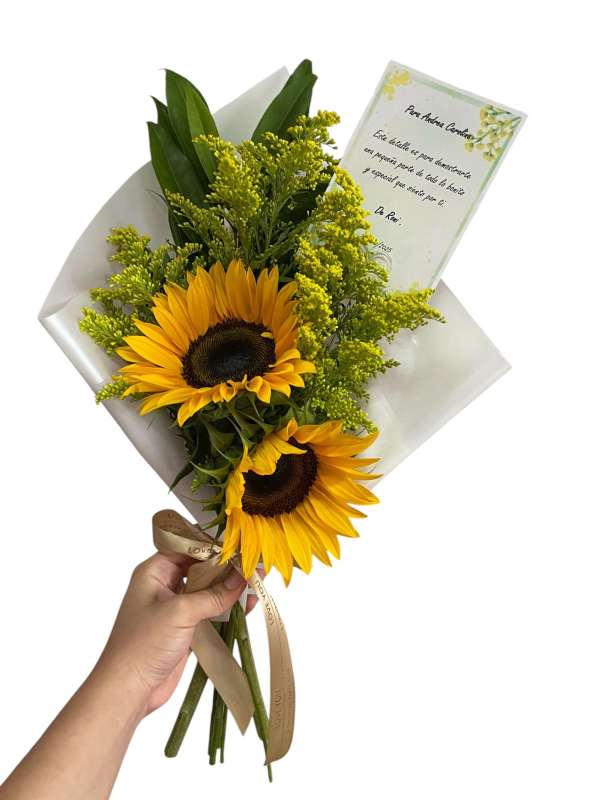 Ramo de dos girasoles acompañado de delicado follaje y envuelto en papel blanco con lazo decorativo. Incluye tarjeta personalizada.
