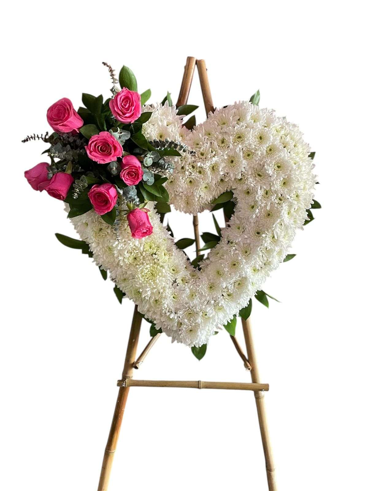 Corona fúnebre en tonos blanco y rosa, compuesta por margaritas, cartucho y follaje, que simbolizan paz, ternura y amor eterno. Disponible en otros colores o tamaños según disponibilidad, incluye pedestal y tarjeta personalizada.